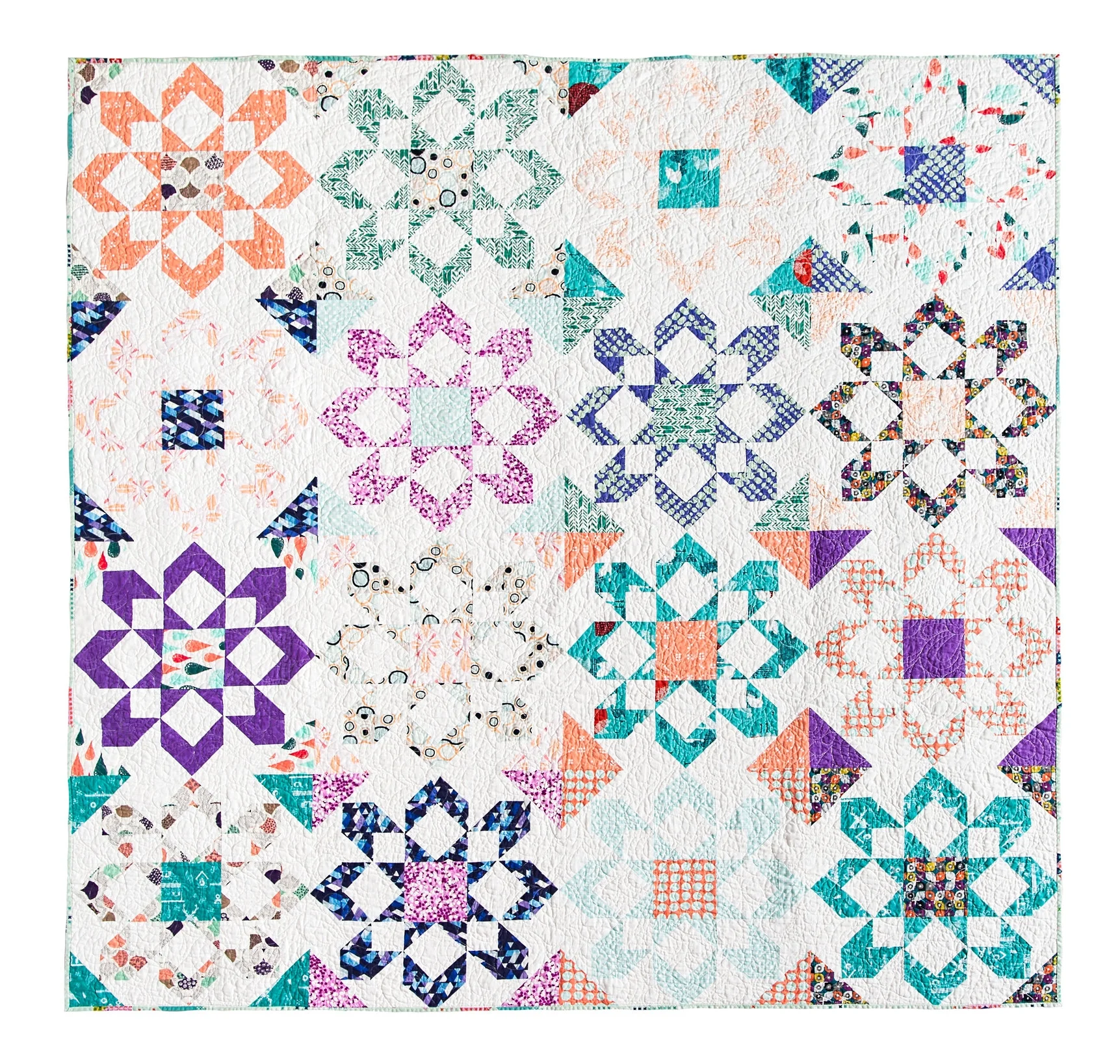 Galaxy Stars is a pattern which includes 13 paper-pieced star blocks and 3 quilt top designs. Featured here is the first quilt top design, “Night Sky”, with a layout that does not conform to a grid - instead, the stars are scattered about the background.